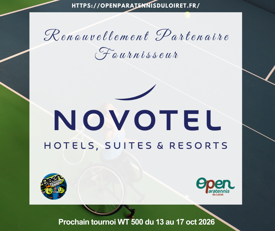 Notre partenaire fournisseur, NOVOTEL (hôtel Novotel à St Jean de Braye), a renouvelé son soutien à l’Open Paratennis du Loiret pour 2026 Novotel Orléans Saint Jean de Braye Officiel https://novotel.accor.com/a/fr/france.html