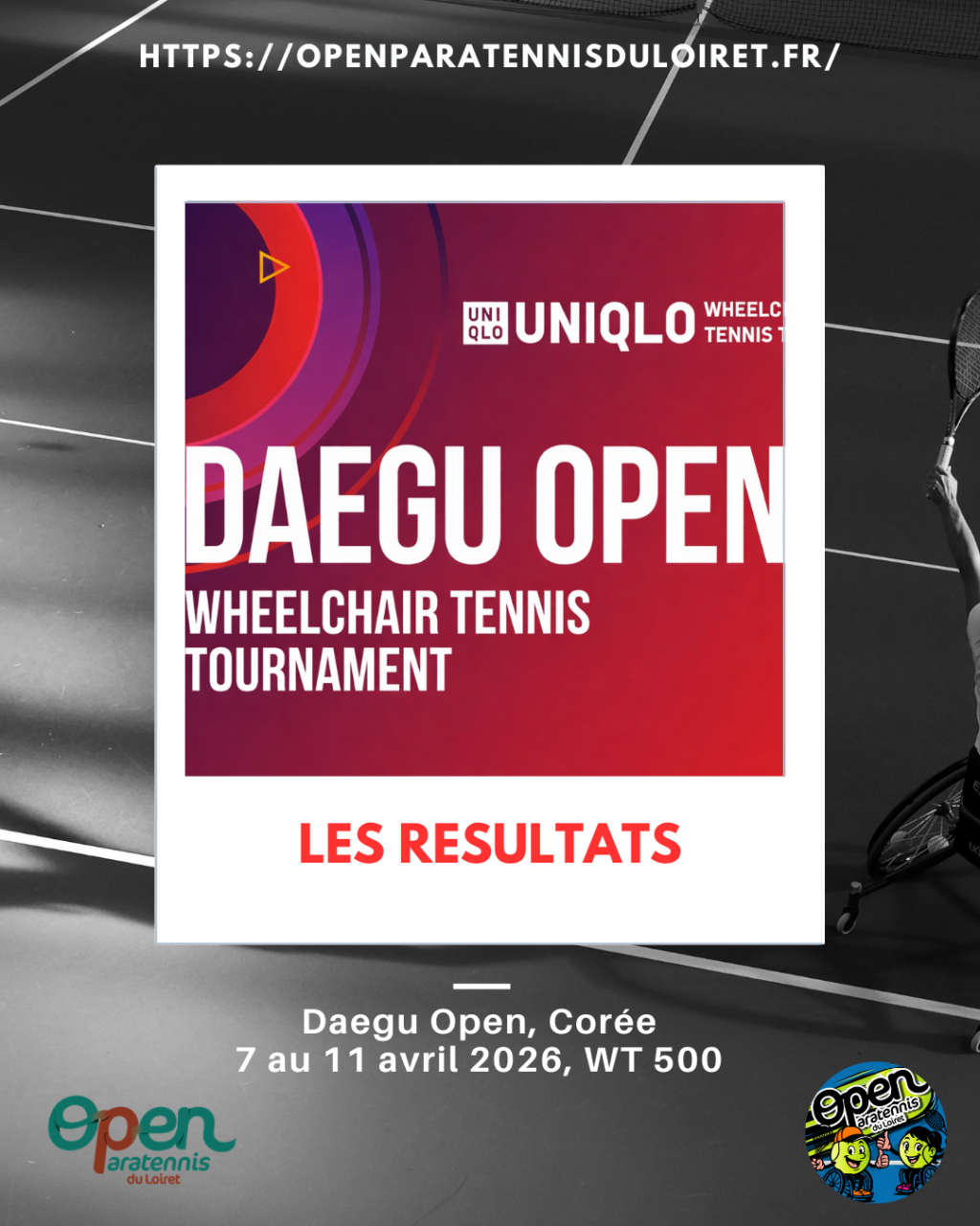 Résultats : Daegu Open, Corée, WT 500, 7 au 11 avril 2026 Simple dames : Xiaohui LI (CHN) – Luoyao GUO (CHN) 6-3 6-3 Simple messieurs : Martin DE LA[…]