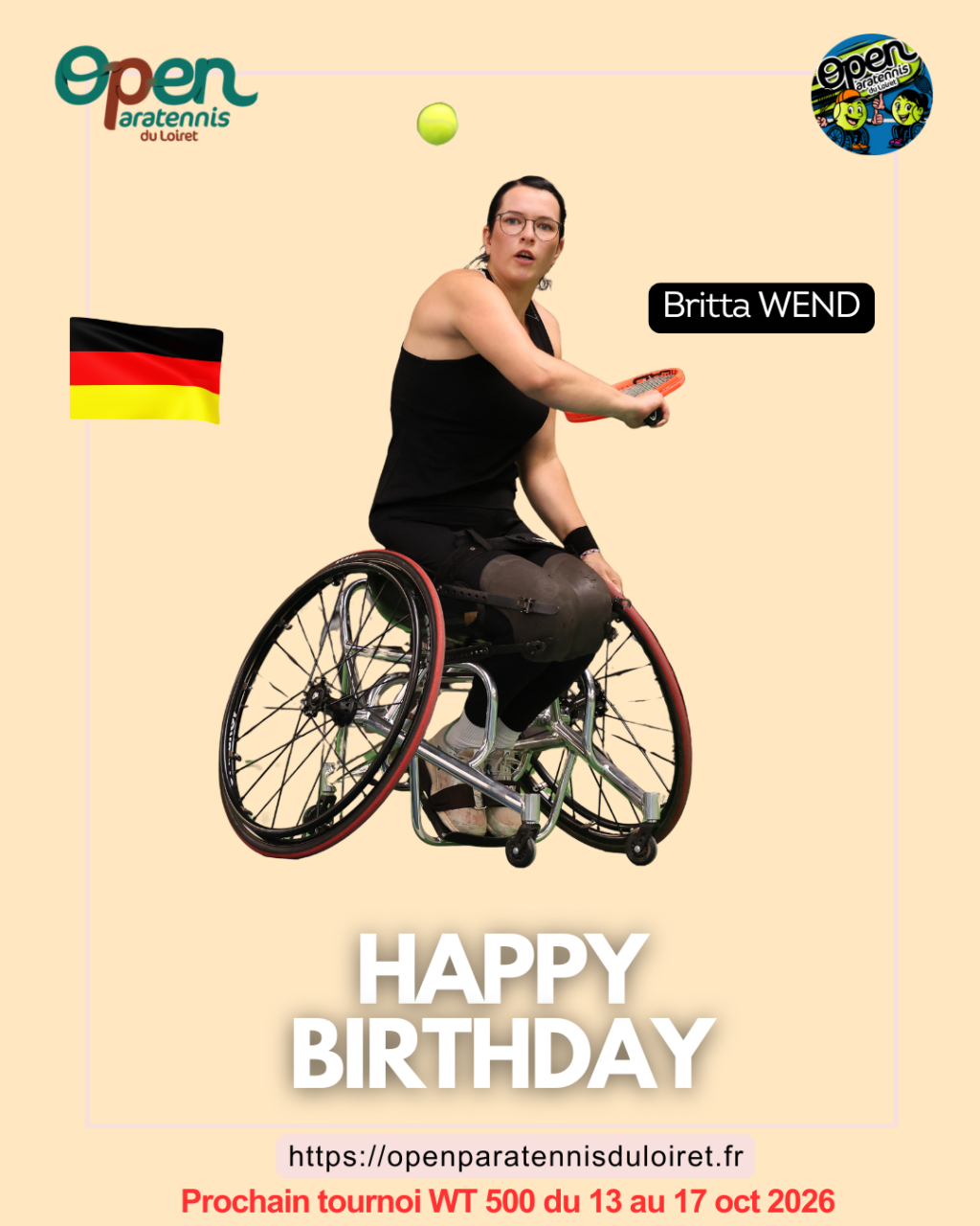 Anniversaire 🎂En cette journée du 4 avril 2026 l’Open Paratennis du Loiret 👩🦽🎾souhaite un joyeux anniversaire à Britta WEND (GER) 28ème au classement mondial