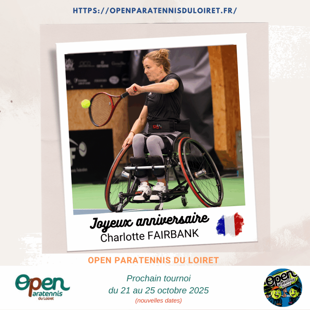 AnniversaireEn cette journée du 22 septembre l’Open Paratennis du Loiret souhaite un joyeux anniversaire à Charlotte FAIRBANK (France) 24ème au classement mondial Charlotte FAIRBANK est inscrite pour la prochaine édition de l’Open Paratennis du Loiret du 21 au 25 octobre. Crédit photo : Grégory Picout