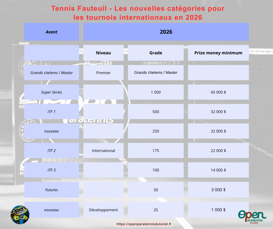 👉A compter du 1er janvier 2026, il y a du changement pour désigner les différentes catégories de tournoi internationaux de tennis fauteuil