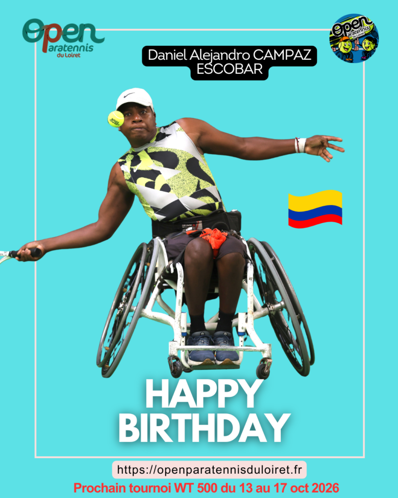 En cette journée du 9 mars 2026 l’Open Paratennis du Loiret 👨‍🦽‍➡️🎾souhaite un joyeux anniversaire à Daniel Alejandro CAMPAZ ESCOBAR (COL) 19ème au classement mondial, catégorie Quad