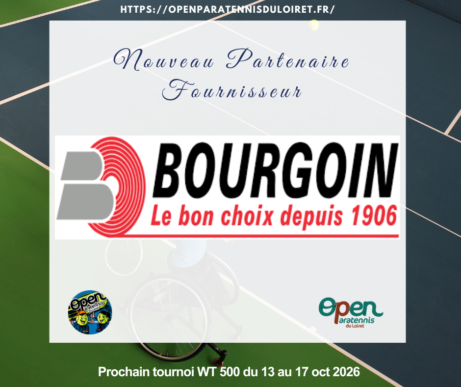L’Open Paratennis du Loiret 👨‍🦽‍➡️🎾👩‍🦽est heureux de vous annoncer l’arrivée d’un nouveau partenaire Fournisseur : l’entreprise Bourgoin à Ormes