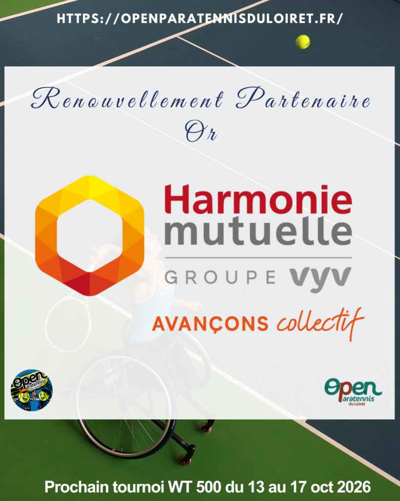 L’Open Paratennis du Loiret 👨🦽🎾👩🦽➡️est heureux de vous annoncer le renouvellement d’Harmonie Mutuelle, pour 2026, en tant que partenaire Or