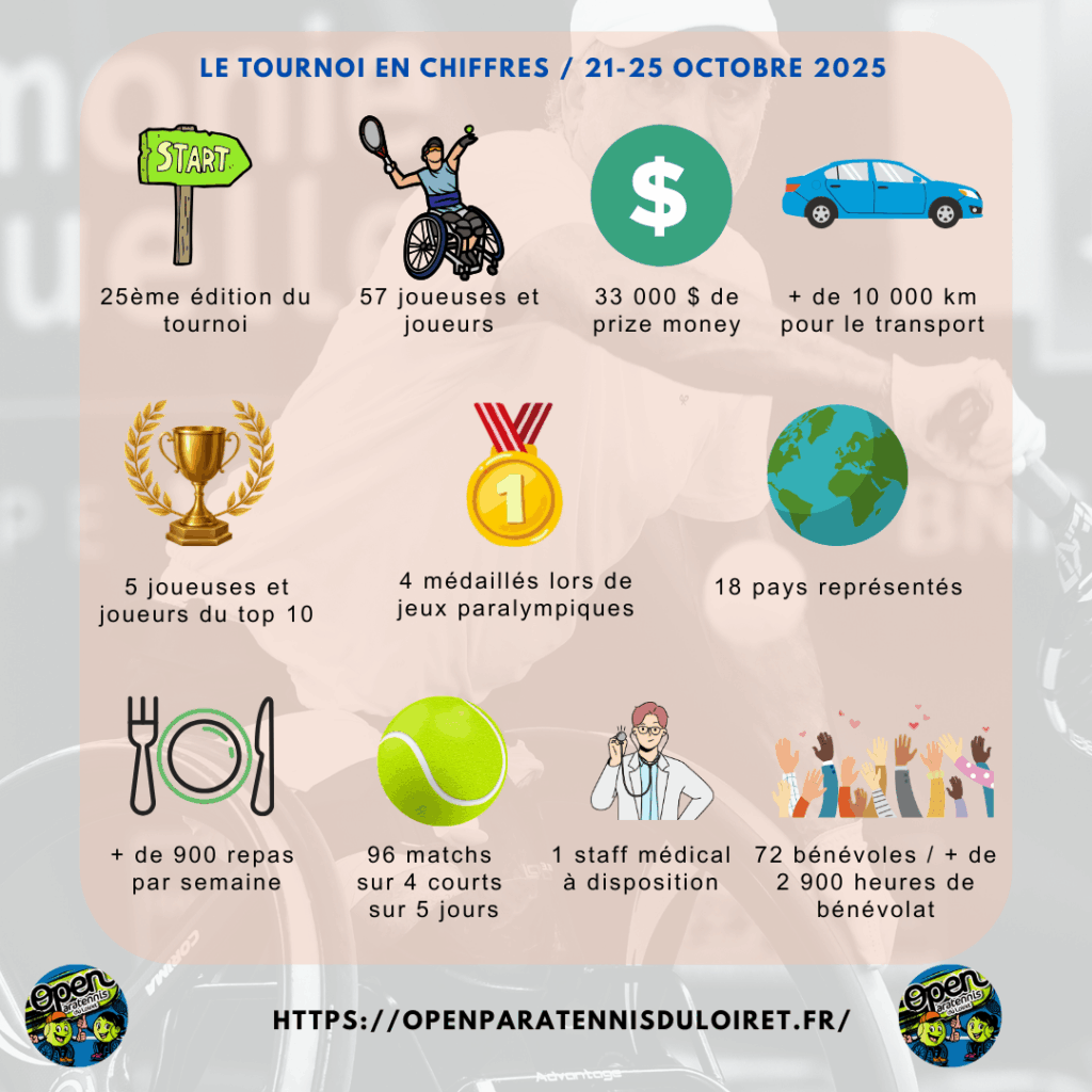 L’Open Paratennis du Loiret en quelques chiffres. Nous vous attendons nombreux du 21 au 25 octobre 2025 C’est gratuit, ouvert à tous, CJF Tennis, complexe de la Forêt à Saran
